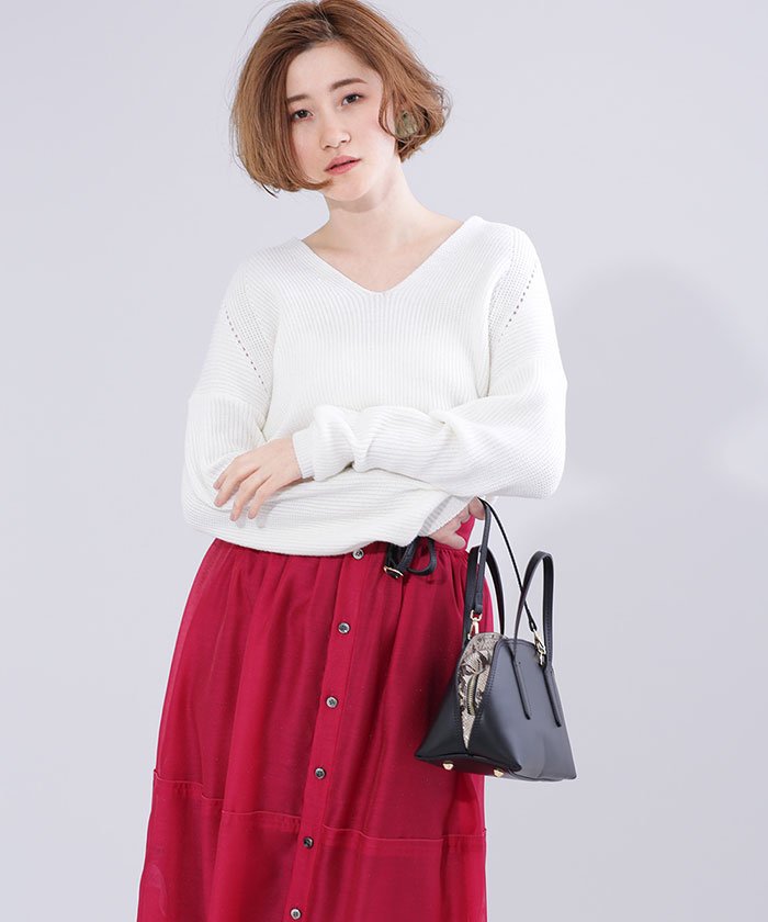 春にふさわしい綿混素材の片畦ニットプルオーバー。綿にアクリルとナイロンを混ぜることで編地に軽さとふくらみをもたせています。定番Vネックのベーシックなデザインですが着ると衿が自然に後ろに下がり、立体的なシルエットを構築。前肩にはアイレットラインを入れて表情豊かに。一枚着でヘルシーに着こなすのはもちろん、襟付きのブラウスやタートルカットソーをレイヤードしても素敵ですね。
