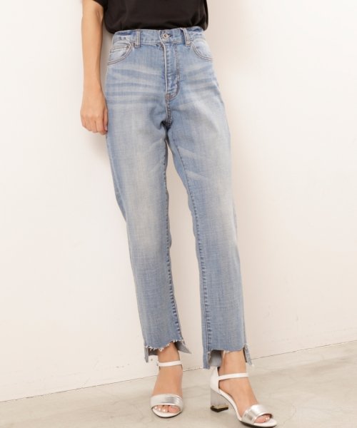 ざっくりと切ったような裾のフレイドデザインとダメージ加工で、こなれ感たっぷりに仕上げたデニムパンツ。裾に向かってほんのりと絞ったテーパードラインがスマートな印象に。ワンピースやガウンと合わせたレイヤードにも大活躍する1本です♪