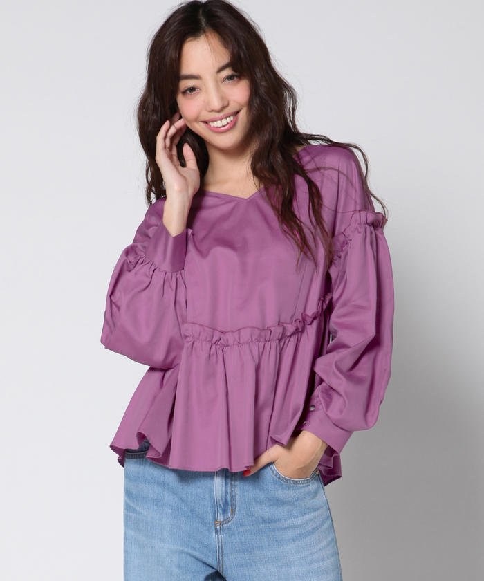 いつもよりも少し地厚なブロード素材を使用しているため、早い時期から着用していただけるボリュームブラウス。袖と裾周りにボリュームを持たせ、今年らしさ満点の一枚に仕上げました。部分的にボリュームを持たせつつも上身頃は切り替えを入れて女性の体に合うように極力コンパクトに仕上げ、着膨れしないようにサイズ感にもこだわっています。デザイン性のあるアイテムなので一枚で華やかに決まるのが嬉しいポイント!ゆるっとしたシルエットなので襟ぐりはVネックにしてシャープさをON。袖やウエスト回りのフリルやギャザーが女性らしさを引き立ててくれます。裾が広がった新化系ペプラムデザインでボトムにはパンツを合わせるのが正解です◎!細身パンツからワイドパンツまで様々なボトムと合わせてコーディネートをお楽しみくださいね!定番のホワイトに加え、爽やかで春らしいピンクとサックスブルーの色展開で重たくなりがちな真冬のコーディネートをグッと明るく彩ってくれます♪
