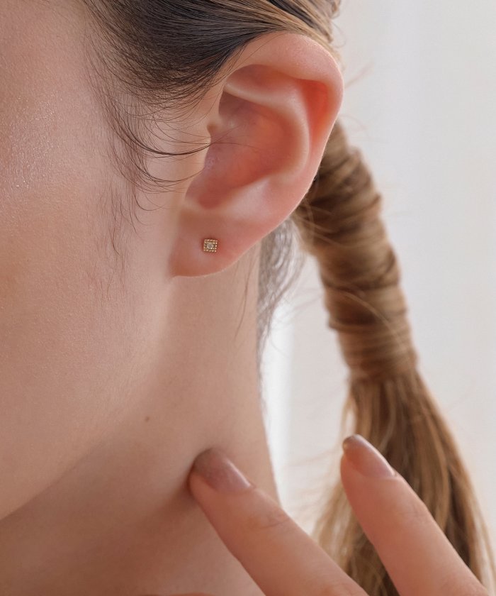 極小のスクエアモチーフが耳元にさり気ないこなれ感を演出します