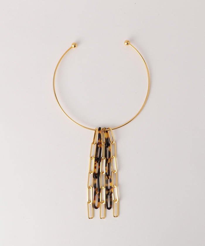 ゴールドとべっ甲柄のアクリルパーツの組み合わせが目を引くチョーカーです。大きめなチェーンモチーフで、シンプルな着こなしの胸元にほど良いインパクトを与えてくれるアイテム。デコルテラインの大きく開いたトップスやワンピースにあしらって、エレガントなアクセントをお楽しみいただけます。