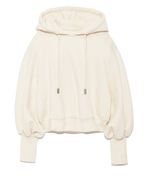 ぽてっとボリュームのあるスリーブに、愛らしいムードが漂う裏毛トップス。フード付きのカジュアル感あふれるデザインで、デイリーのコーディネートに活躍します。袖口は幅広のリブできゅっとシェイプして、重たいイメージになるのを回避。