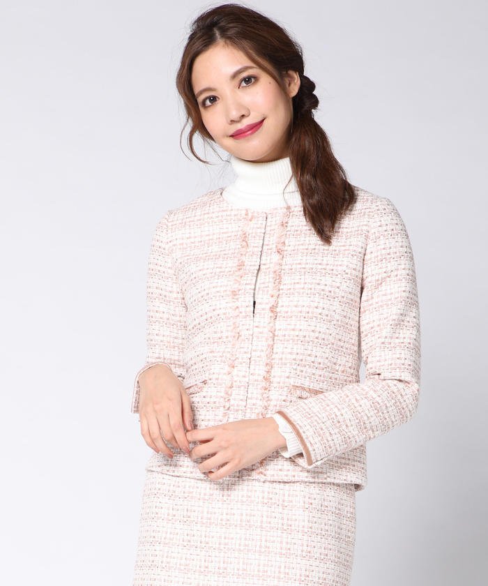 【マザーニーズ商品】高級なツイードを用いたマザーニーズ需要に適したジャケット。コットンベースに柔らかな色のカスリ染めを加え、繊細なカラーミックスと光りすぎない表情がとても上品なのでキレイめに着用していただけます。価値のある素材で高級感がありますがフリンジ使いのデザインが程良くカジュアルで◎ 行事以外にも合わせ方によってはデイリー使いが可能なアイテムです。