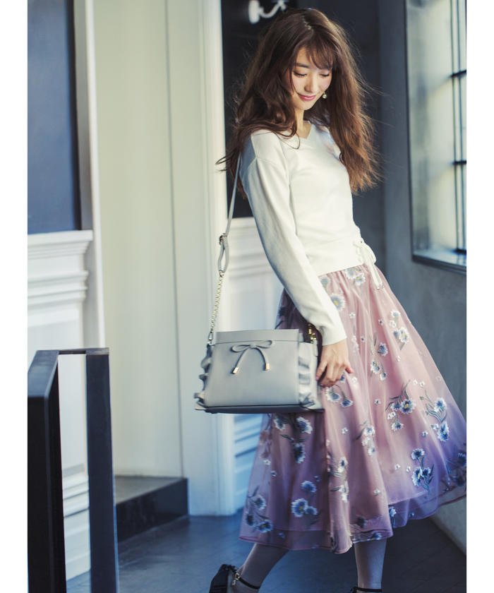 フラワーモチーフの刺繍がスタイリングのアクセントになるスカート。チュールでふわっと揺れるシルエットも大人可愛いポイント!透け感のある裾が春らしい印象を引き出し、シンプルなニットとのコーディネートで春のスタイリングが完成!