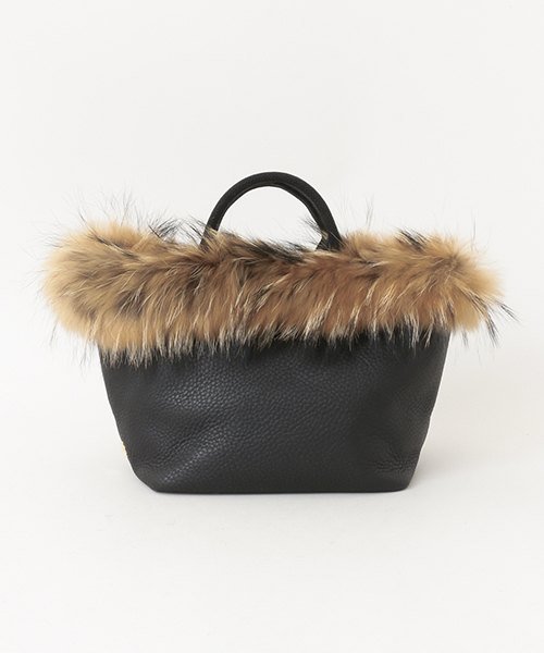 素材はきめ細かい毛並みのリアルラクーンファー(タヌキ)を使用。中の空間はたっぷりと広く、ハンドル部分はしっかりとしたコットン地を用いる事により荷物の重さをしっかりと受け止めてくれます。レザーバッグと同じ仕様の作りなので、携帯、ファスナー付きポケットが内側に3箇所ありとても便利。