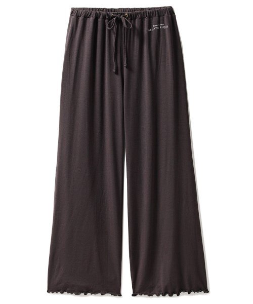 とろとろと肌へ落ちる、柔らかなレーヨン素材のロングパンツ。フロントにあしらったロゴプリントは、マニッシュな雰囲気を漂わせます。波打つメロー始末のヘムで、甘いムードもプラス。リラックスしつつも、広がり過ぎないシルエットでラフさをほどよく抑えます。