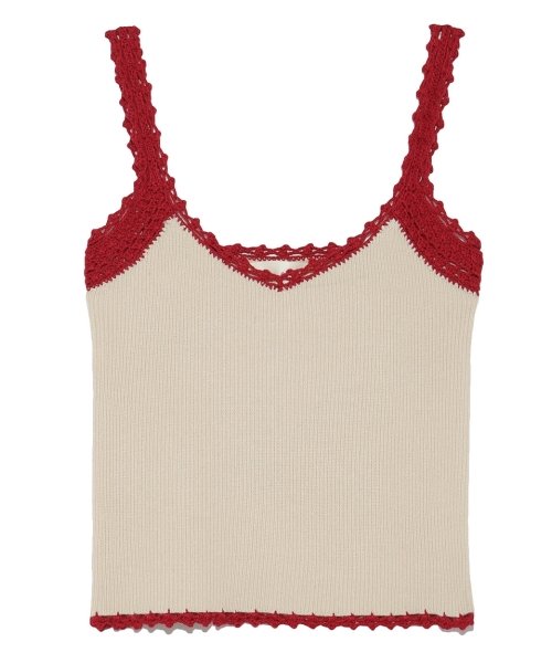 レトロな雰囲気を漂わせる、かぎ針ラインでトリミングしたキャミソール。しなやかなリブニット仕立てで、ピタッとボディへ沿うタイトシルエットを描きます。浅いV字を作ったデコルテの開きが、顔周りをすっきり見せるポイント。