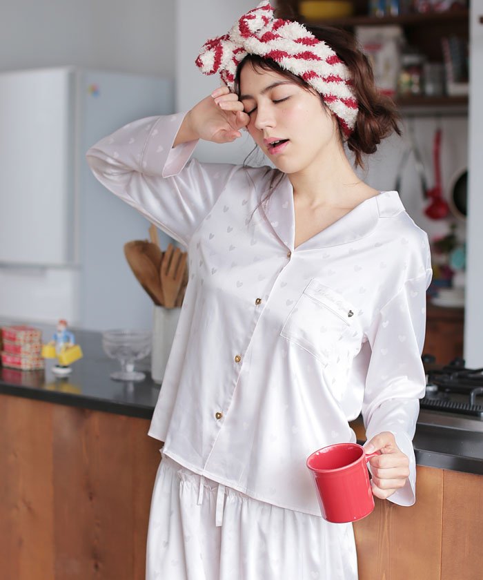 スモーキーなピンクとネイビーの発色にもこだわったオリジナル生地は、光沢感が上品なサテン素材に、小ぶりのかわいいハート柄をジャガード織りすることで、さらに高級感がアップしました。シャツは、襟元に丸みをもたせ、パイピングを施すことで、上品な印象に仕上げました。丈は、やや短めにしてボトムインして着た時に、バランスよく見えるラインを計算しています。同素材でロングパンツとショートパンツも用意。