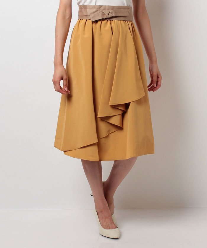バイアスに流れるフリル使いがフェミニンなラップ風フレアスカート。配色の異なるサッシュベルトがセットになった、今季らしく装えるアイテムです。トップスはインですっきり着こなして!