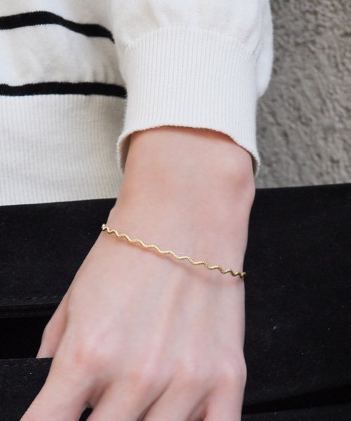 華奢で女性らしいラインが美しい、極細のワイヤーバングル。袖口でもたつくこともなくすっきりとコーデに馴染み、さりげなく手首を細く見せてくれます。主張しすぎないシンプルなデザインなので腕時計と合わせたり、ほかのブレスレットと重ね着けして楽しむこともできます。色違いで2連で着けるのもおすすめです。