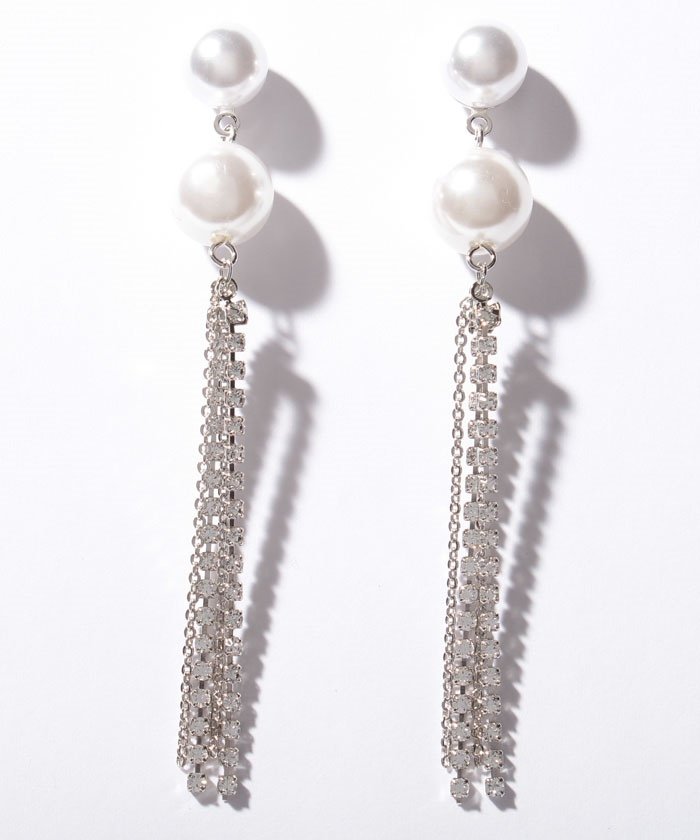大小のパールにラインストーン&チェーンをあしらった、縦長のシルエットが美しいデザインのスイングピアス。パーティシーンにはもちろん、デイリースタイルの格上げにもお勧めしたいアイテムです。