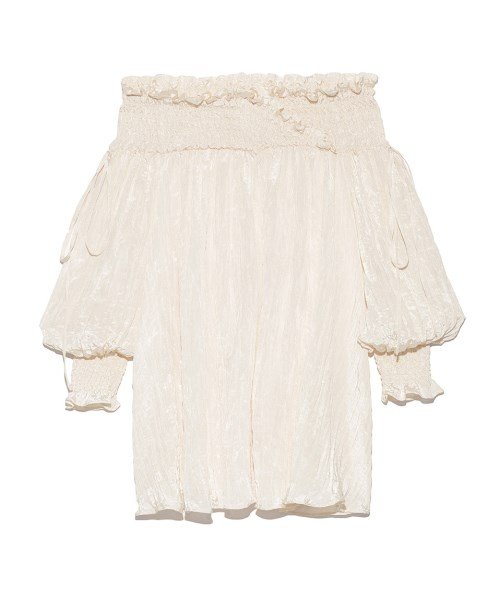 シワを寄せた光沢のある生地で、印象深い華やぎをまとうオフショルブラウス。