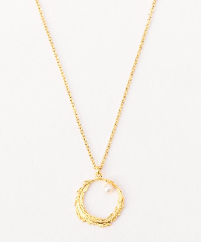 サークル状に象られた繊細なフェザーモチーフに、一粒パールをあしらったネックレス。上品なきらめきのパールがゴールドの華やかな質感に映えて、胸元の印象をエレガントに演出します。ヴィンテージライクな存在感と、ロマンティックなストーリーを感じさせるアイテムです。