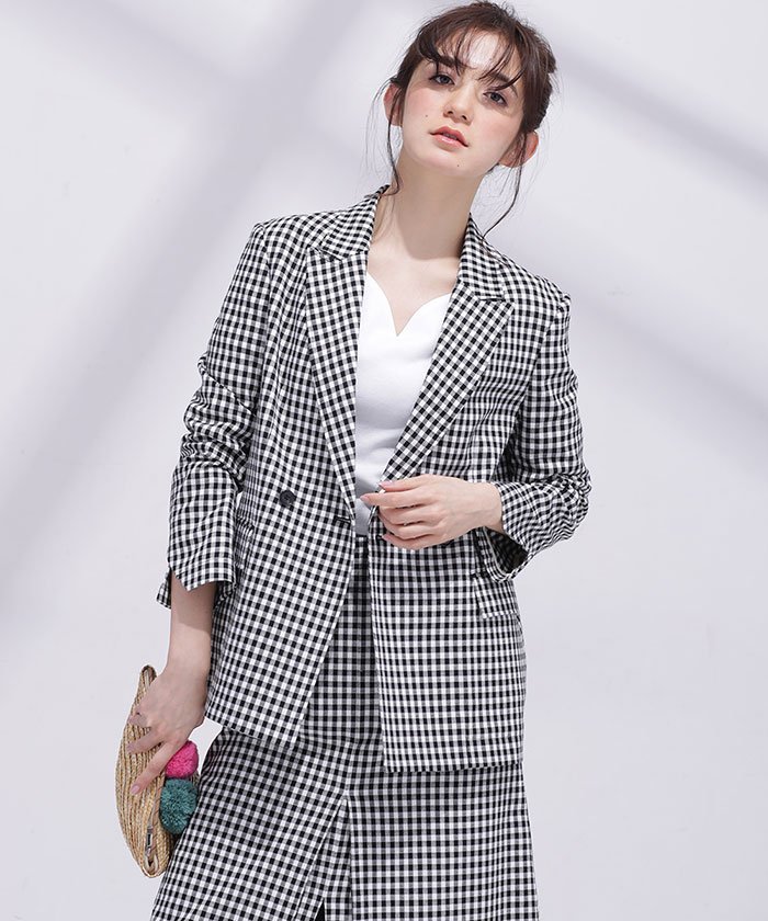 注目のギンガムチェックパターンで仕立てた、ダブル合わせのモード感ある一着。大きすぎず程よい細さで作っているので、ジャケット慣れしていない方でも手に取りやすいデザイン。デニムと合わせたりワンピースの上から羽織ったりと、色々な印象で着まわせます。パンプスやスニーカーはもちろん、スクエアトゥのブーツと合わせたトレンドライクなスタイリングも素敵。柔らかい生地なので寒い時期はアウターなどを上から着ても◎。ブラックチェックのパターン2のほか、他にないきれいなブルーのパターン1もおすすめです。
