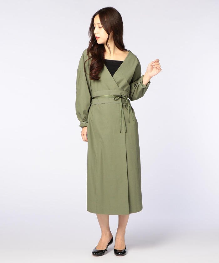 身幅にゆとりを持たせたシルエットで、幅広いコーディネートをお楽しみいただけるワンピース。ハイウエストの切り替え位置にスナップ式のワンボタンをあしらったシンプルなデザインの一着は、ベルトアレンジや前を開いた着こなしで、ワンピースとしてもローブタイプのコートとしてもご着用いただける優れものです。