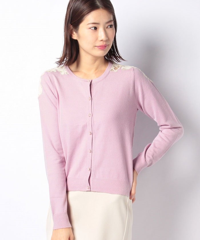 ショルダーを飾る起毛レースの切替えがフェミニンな表情を見せてくれるクルーネックニットカーディガン。パールボタンがリッチなアクセントになってくれるアイテムは、ロングスカートなどを合わせても素敵です。