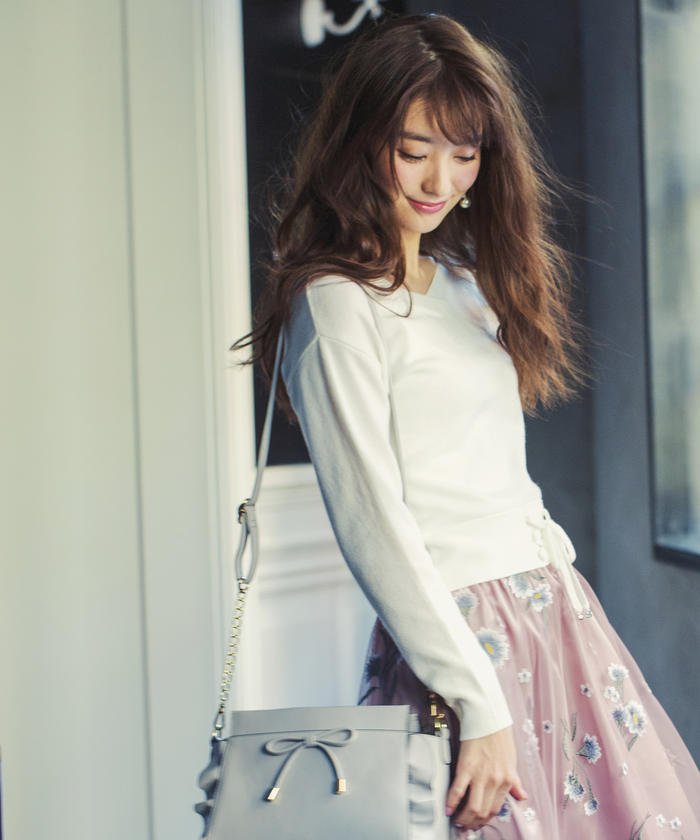 ウエスト部分のレースアップがさりげないポイントのニット。パール調ビーズがほんのり上品さをプラスします。前後2WAYで着用できるので、スタイリングに合わせて楽しめるのも嬉しいポイント♪