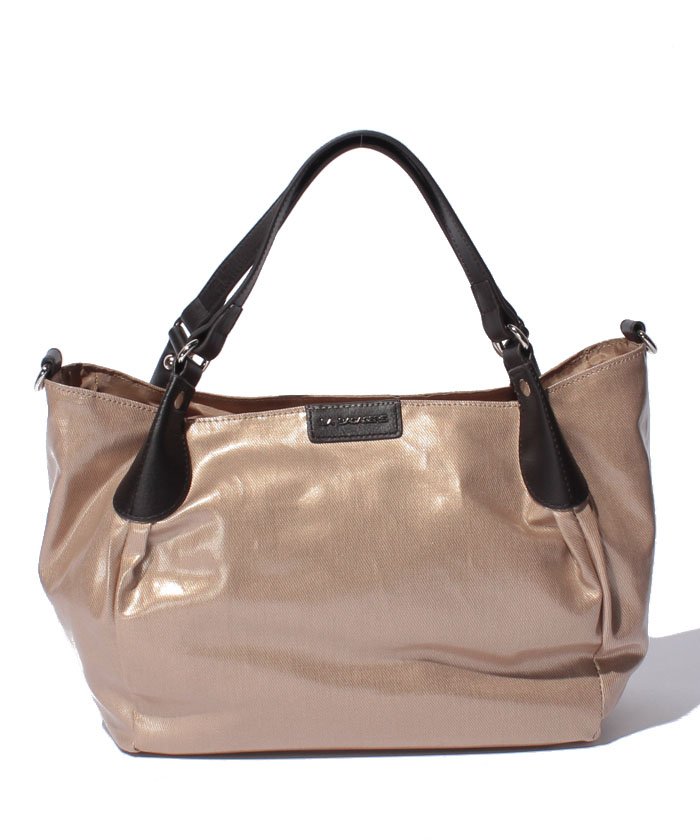 三室式設計、取り外しのできるショルダーストラップ付の使い勝手のいいトートバッグ。つやのあるルックスが大人っぽい雰囲気のアイテム。